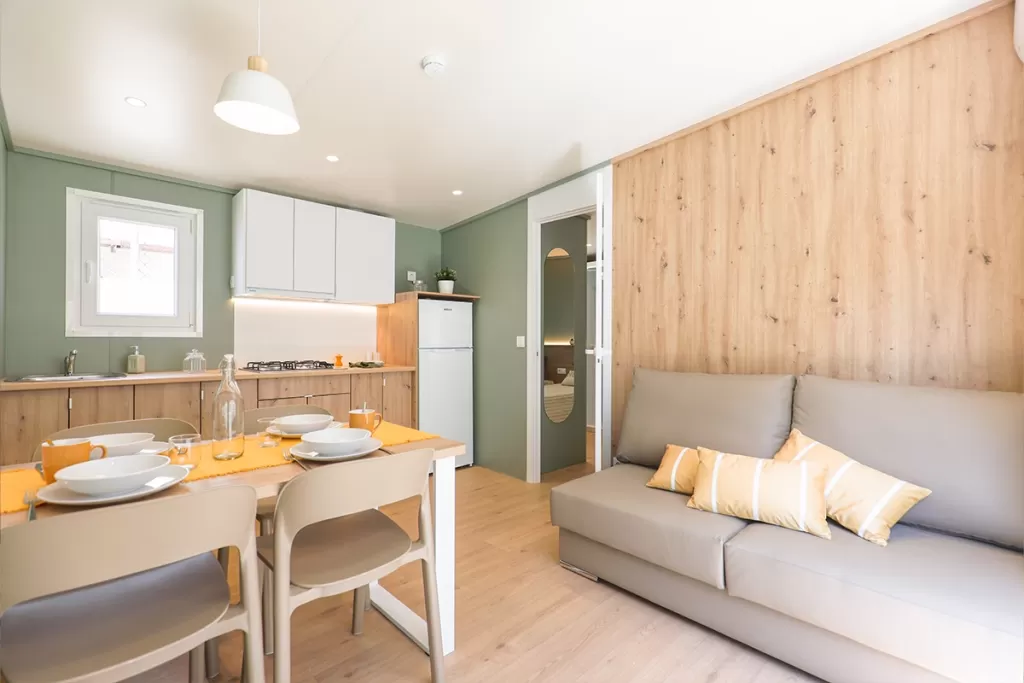 Ce mobil-home dispose d’un coin salon – salle à manger convivial, parfait pour partager de bons moments après une journée de découvertes. La cuisine équipée met à votre disposition tout le nécessaire pour votre séjour : vaisselle, cafetière, micro-ondes… afin de vous sentir comme à la maison.
