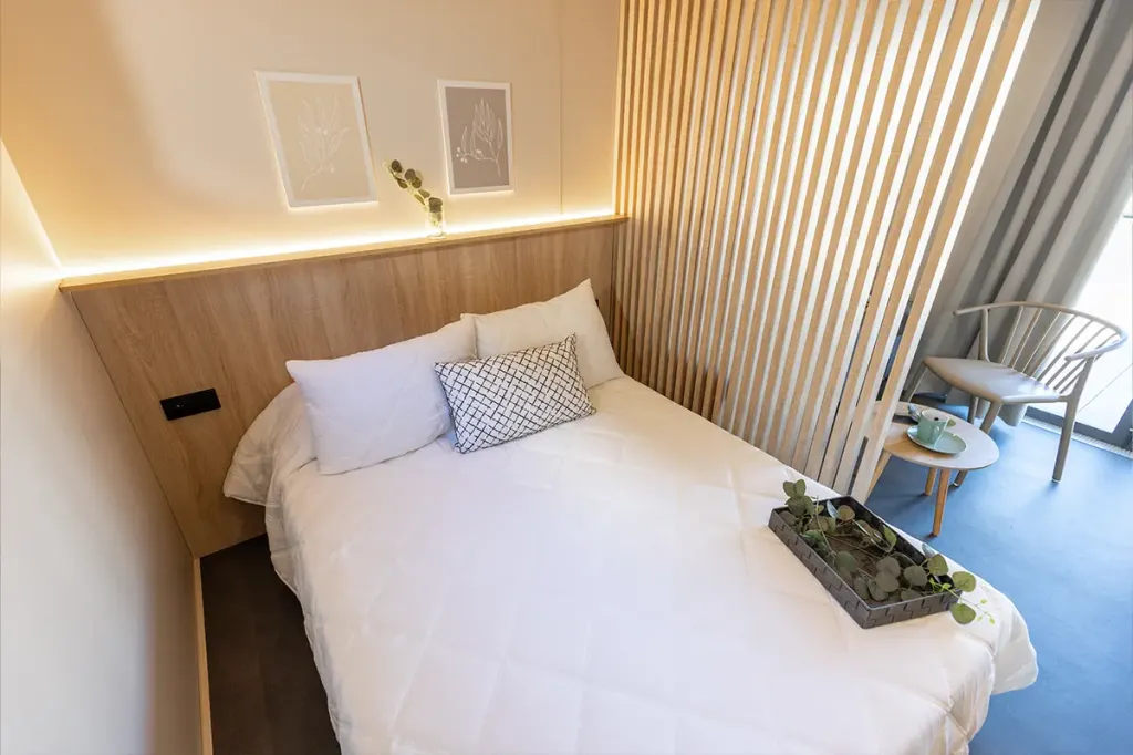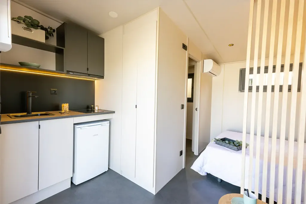 Ce module peut être associé à un second hébergement identique. Ensemble, ils permettent d’accueillir jusqu’à 4 personnes, tout en conservant l’indépendance de chacun. Idéal pour deux couples d’amis ou une famille souhaitant partager des moments conviviaux tout en préservant leur intimité.